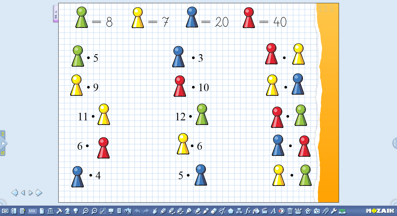 With the help of mozaTools, you can create many different types of exercises to practice mental calculation, which help to develop attention skills and visual perception at the same time. It helps with solving the exercise if operations are animated. See images below to have more ideas of how you can use mozaBook to help your students develop memory and attention skills.