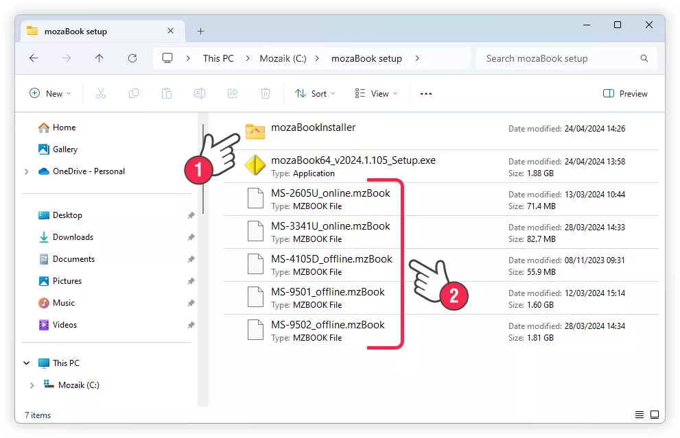 หากมีโฟลเดอร์นี้อยู่แล้วตั้งแต่เริ่มต้นการติดตั้ง (1) ส่วนประกอบที่ขาดหายไปก็จะไม่ถูกดาวน์โหลดจากอินเทอร์เน็ต แต่จะถูกติดตั้งจากโฟลเดอร์ 'mozaBookInstaller' แทน