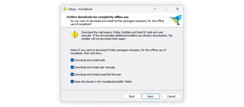 ส่วนประกอบที่เลือกจะถูกดาวน์โหลดจากอินเทอร์เน็ตและจะถูกจัดวางไว้ในโฟลเดอร์ mozaBookInstaller