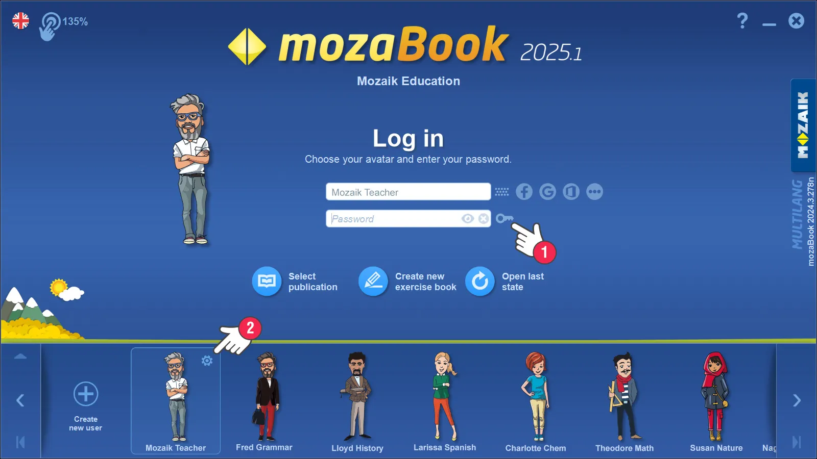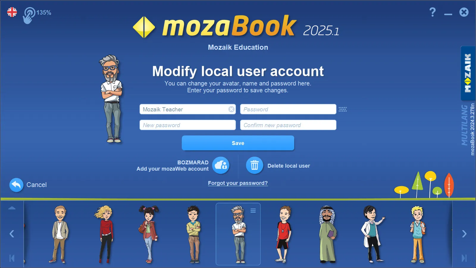 mozaBook ช่วยให้ผู้ใช้จำนวนหลายคนสามารถใช้ซอฟต์แวร์บนคอมพิวเตอร์เครื่องเดียวกันได้ (เช่น ครูผู้สอน 2-3 คนในห้องเรียนเดียวกัน) โดยมีภาพวาด บันทึก การนำเสนอ และเนื้อหาที่ถูกสร้างและแทรกเข้าไปในซอฟต์แวร์จะถูกบันทึกไว้ในบัญชีของผู้ใช้ในท้องถิ่นได้เสมอ ดังนั้นผู้ใช้ดังกล่าวสามารถมองเห็นข้อมูลเหล่านั้นได้เท่านั้น ถือเป็นเรื่องจำเป็นที่โปรแกรมจะต้องสามารถระบุผู้ใช้ในพื้นที่ได้