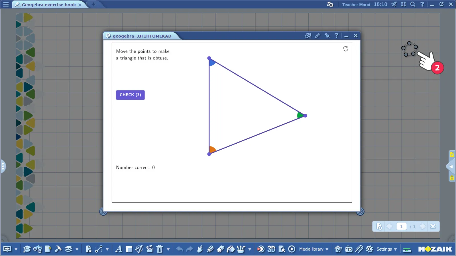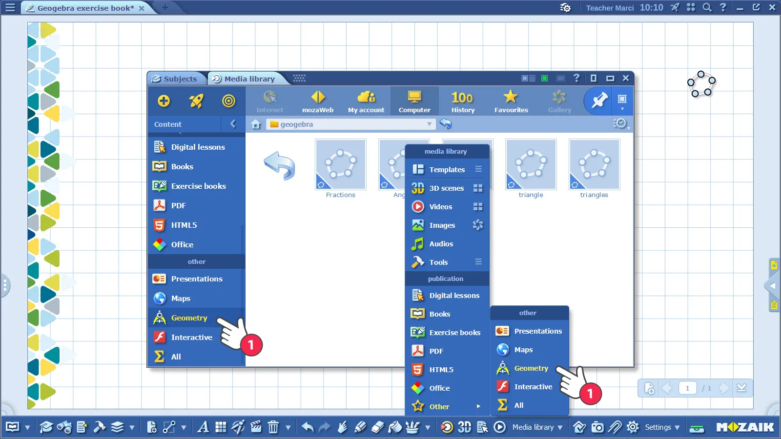 คุณสามารถเปิดใช้งานเนื้อหา GeoGebra ใน mozaBook ได้ นามสกุลไฟล์ GeoGebra คือ .ggb คุณสามารถค้นหาไฟล์เหล่านี้ได้ในเมนู Geometry ของห้องสมุดมีเดีย (1)
