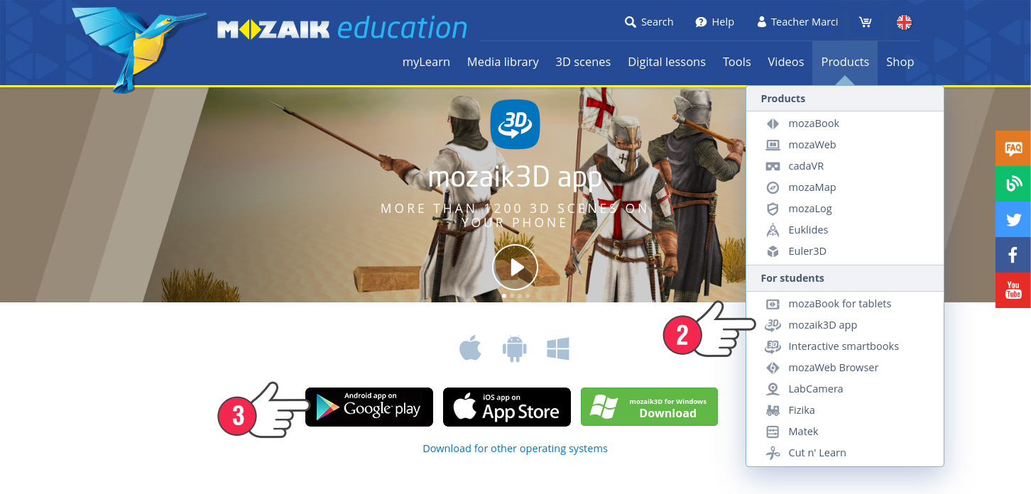 คุณยังสามารถค้นหาแอปพลิเคชัน mozaik3D ได้ในเมนู ผลิตภัณฑ์ (2) คุณสามารถเริ่มการติดตั้งได้จากที่นี่โดยคลิกที่ปุ่ม Google play (3)