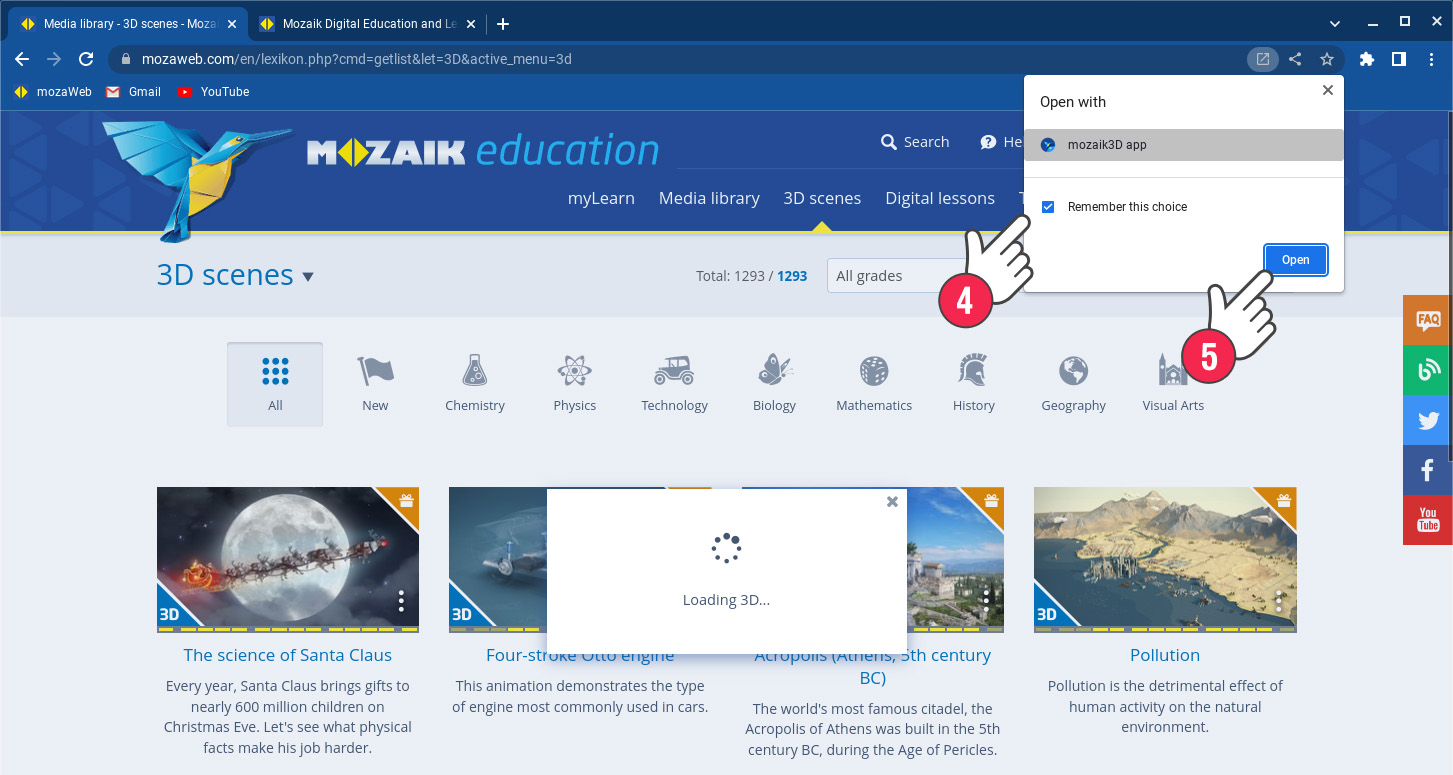 เมื่อคุณติดตั้งแอปพลิเคชัน mozaik3D แล้ว ให้เปิดฉาก 3 มิติ คุณจะเห็นหน้าต่างการแจ้งเตือนของเบราว์เซอร์ (4) ในหน้าต่างนี้ ทำเครื่องหมายที่ช่องทำเครื่องหมายแล้วคลิก 'เปิด' (5) เพื่อให้ครั้งต่อไปที่คุณพยายามเปิดฉาก 3 มิติ ฉากนั้นจะเปิดขึ้นโดยไม่มีการแจ้งเตือน