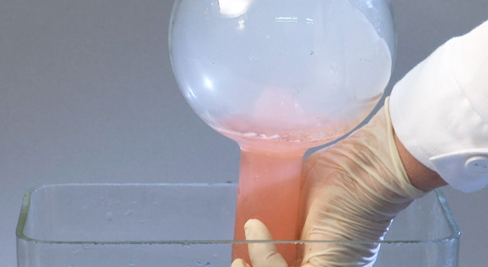The dissolution of HCl in water leads to a drop in pressure, which causes the water in the bowl to rush into the flask.